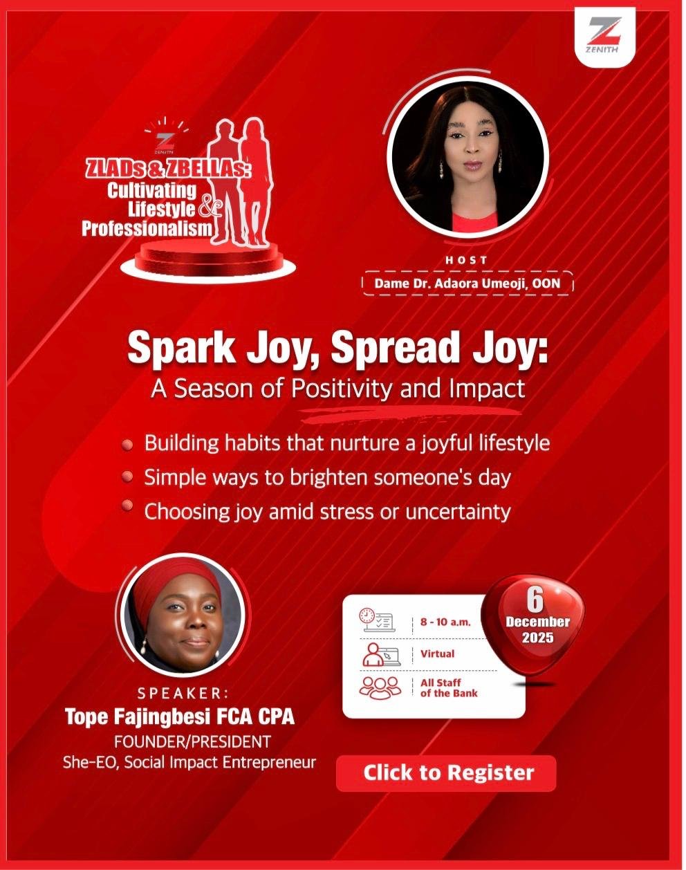 I am honored to join Zenith Bank’s ZLADs & ZBELLAs Forum for an inspiring December edition centered on joy, resilience, and intentional living. This session explores joy as both a personal responsibility and a collective gift—reminding participants that even in challenging seasons, we can choose positivity and create meaningful impact.