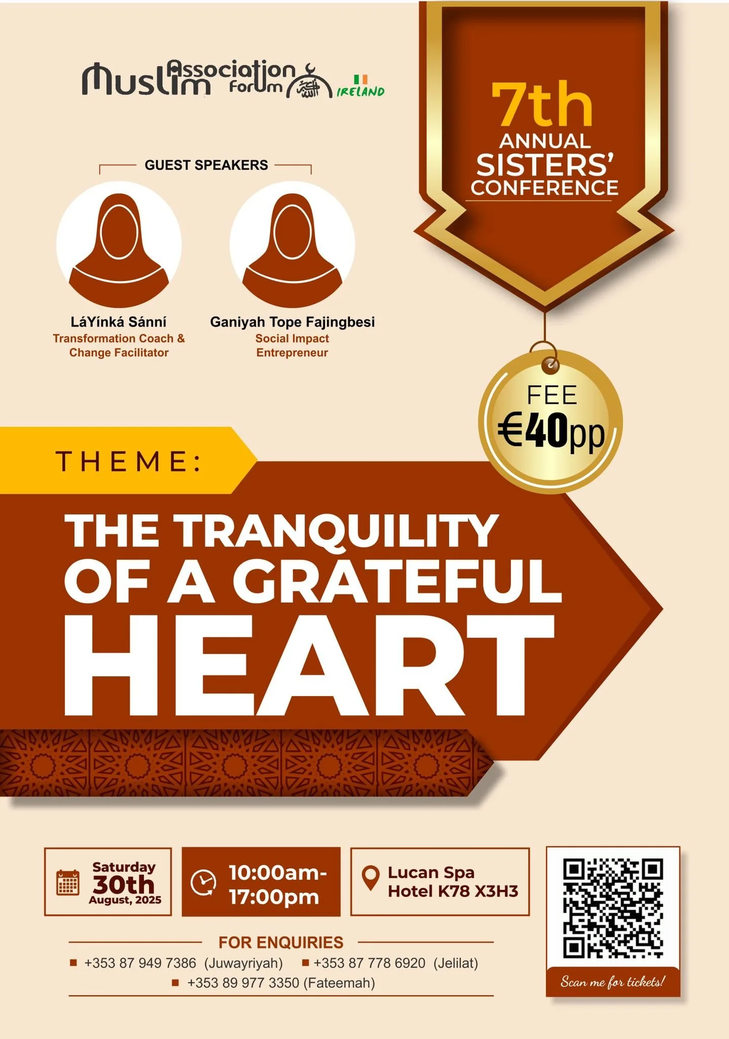 The 7th Annual Sisters’ Conference brings the theme “The Tranquility of a Grateful Heart.” It is a faith-inspired gathering celebrating gratitude, sisterhood, and spiritual growth. With transformative talks, soulful reflections, and inspiring guest speakers, this year’s edition will nurture hearts, spark connection, and strengthen belief.